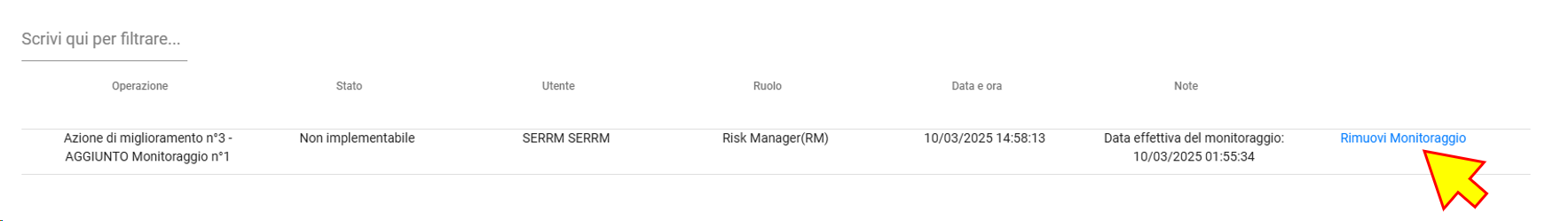 si aprirà una maschera pop up con l'elenco delle operazioni effettuate sulla scheda; per ogni monitoraggio aggiunto verrà riportata una riga con in fondo il voce "Rimuovi Monitoraggio":