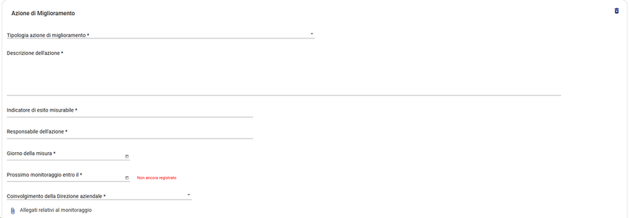 Per eliminare un'azione di miglioramento bisognerà cliccare sul simbolo del cestino, posizionato in alto a destra nella scheda che si vuole cancellare: