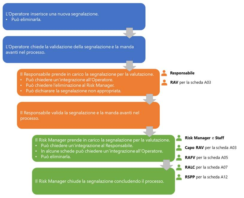 Il processo di segnalazione a partire dall’inserimento, proseguendo con la validazione, fino al completamento, vede coinvolti attori diversi che possono compilare campi ed eseguire operazioni sulla segnalazione.