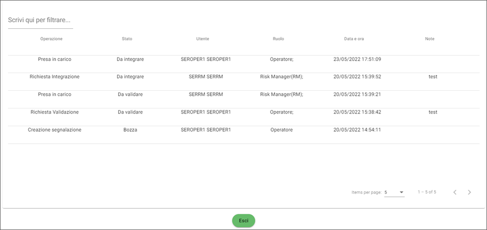 Nella lista dello Storico delle operazioni sono censite tutte le attività svolte sulla segnalazione, lo stato in cui si trova la segnalazione in seguito all’operazione, l’utente che l’ha eseguita con il suo ruolo, l’istante in cui è stata eseguita ed eventuali note inserite.